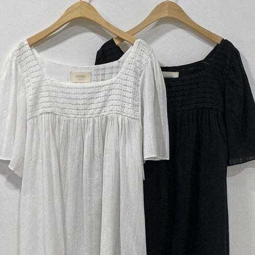 옷자락 / 여성용 리본 라운드 버튼 빅사이즈 펀칭 코튼 롱 드레