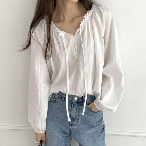 [유야]넥스트링 면 레이스 퍼프 블라우스 남방 하객룩 -BL0058H- 빅사이즈 루즈핏 여성 봄 여름