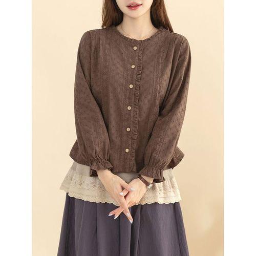 빅사이즈 레이스 편안한 이너티 춘추복 솔리드 예쁜 블라우스 가을 겨울 여성용 부드러운 긴팔 상의