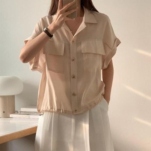 [옷자락]여자 스티치 포켓 빅사이즈 카라넥 청남방 반팔 셔츠