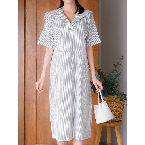 [드리다]여름 스트라이프 브이넥 세일러 빅사이즈 A라인 플레어 롱 원피스 휴양지 휴가 하객 모임 오피스..
