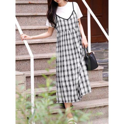 [드리다]여성 여름 체크 뷔스티에 주름지 빅사이즈 레이어드 롱 원피스 미시 캐주얼 등원 출근 바캉스룩