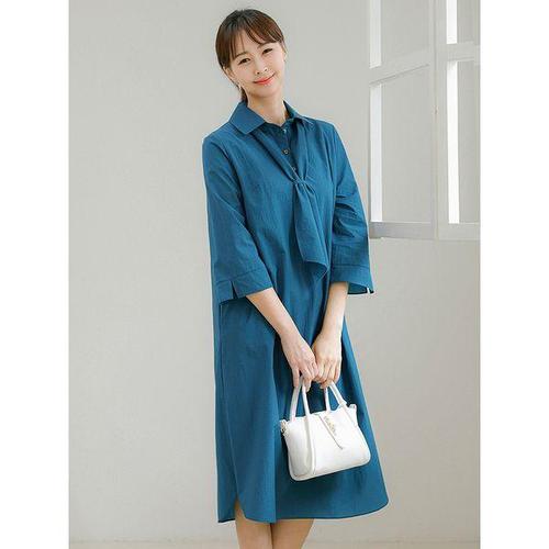 [드리다]여성 여름 지지미 바스락 카라 타이 빅사이즈 원피스 40-50대 미시 중년여성 엄마옷 하객 모임