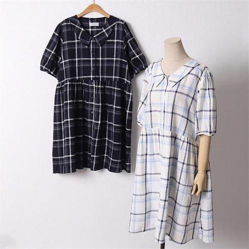 [끌레아]은창]W레터링 카라넥 베이직 롱 원피스 여름 치마 빅사이즈 원피스 루즈핏 퍼프 반팔 롱원피