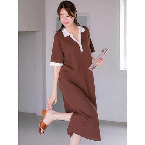 [드리다]여성 여름 카라 배색 빅사이즈 맥시 롱 반팔 원피스 40-50대 미시 중년여성 엄마옷 모임 캐주얼 ..