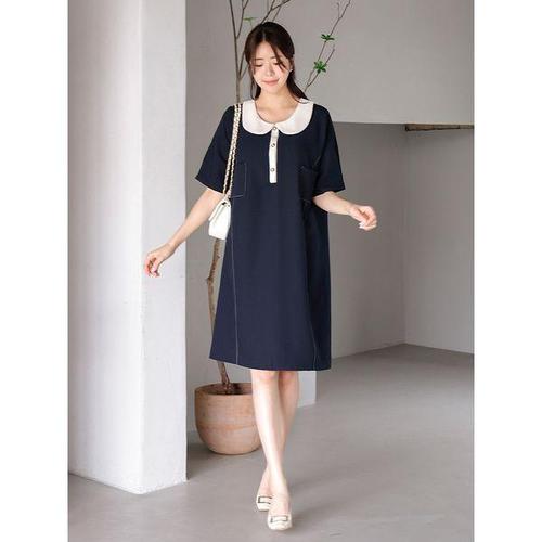 [드리다]여성 여름 배색 카라 반오픈 H라인 빅사이즈 반팔 원피스 40-50대 미시 하객 상견례 모임 오피스..