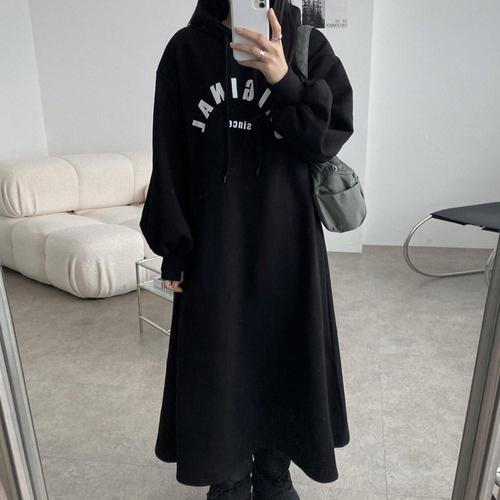 POMTOR 여성 가을 겨울 오빅사이즈 기모 후드 긴팔원피스 데일리 캐주얼 롱맨투맨 롱원피스