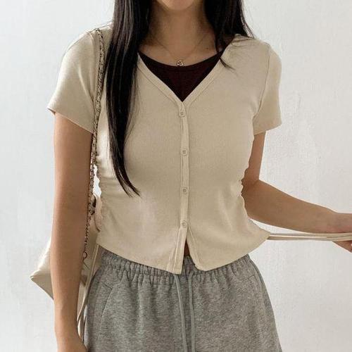 지고다그 여성용 여름 반팔 티셔츠 백리본 트임 디자인 슬림핏 크롭티 스트레치 캐주얼 상의 데일리룩 YZH72819