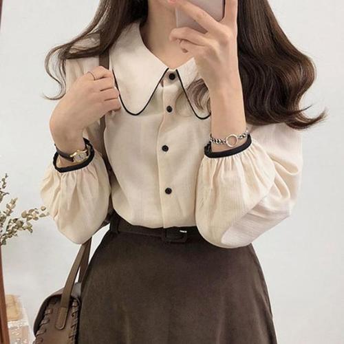 [신상오픈런]배색 얇은긴팔 빅카라 슬림핏 셔링블라우스 하객룩 (30546397)