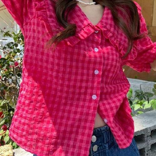 [모노무드]모노무드 EDT 체크 패턴 블라우스 여성 여름 루즈핏 빅카라 셔츠