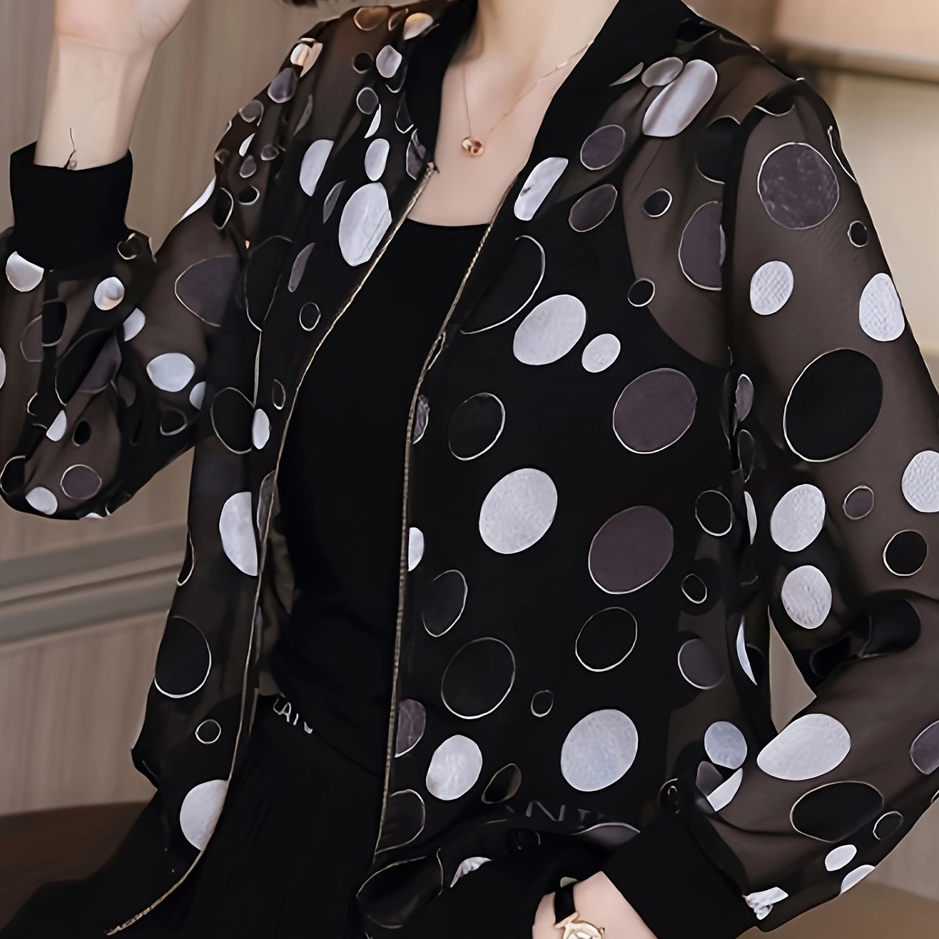 TEMU 여성용 경량 여름 보호 베이스볼 재킷 - 긴 소매 반투명 기하학 도트 디자인, 루즈핏 캐주얼 사이클링 및 야외 썬 코트 지퍼 프론트, 통기성 원단