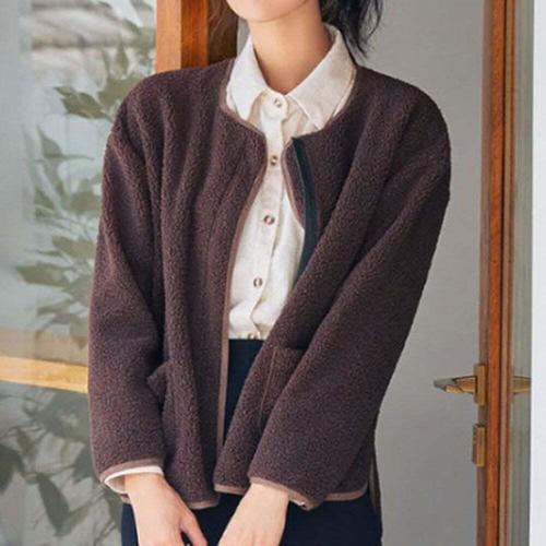 [옷자락] 여자 뽀글이 노카라 배색 파이핑 포켓 루즈핏 가디건