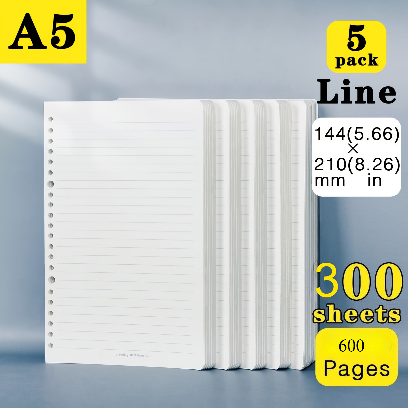 TEMU 5개 팩, 300매/600페이지, A5/B5 분리형 휴대용 루스リー프 종이 리필, 바인더, 노트북 삽입지, 다이어리용, 학생, 사무실, 문구류 정리용으로 이상적, 명언 로그북