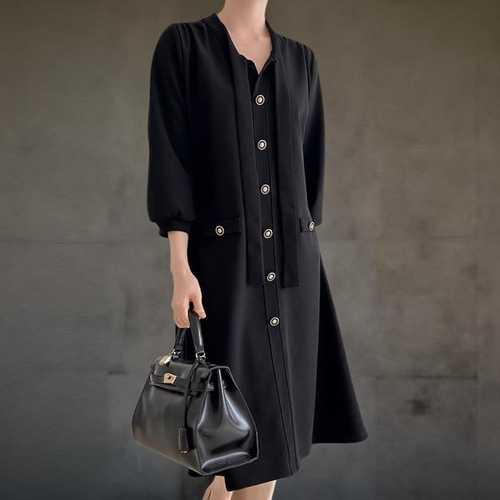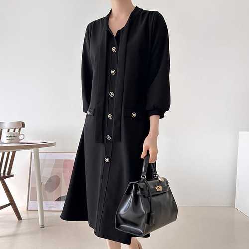 옷자락 / 여성 가을 하객 패션 리본 상견례 A라인 버튼 롱 드레