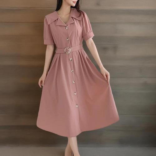 [신상오픈런]여성 하객 패션 상견례 드레스 벨트 카라 버튼 반팔 롱드레스 (34574417)