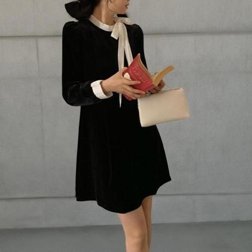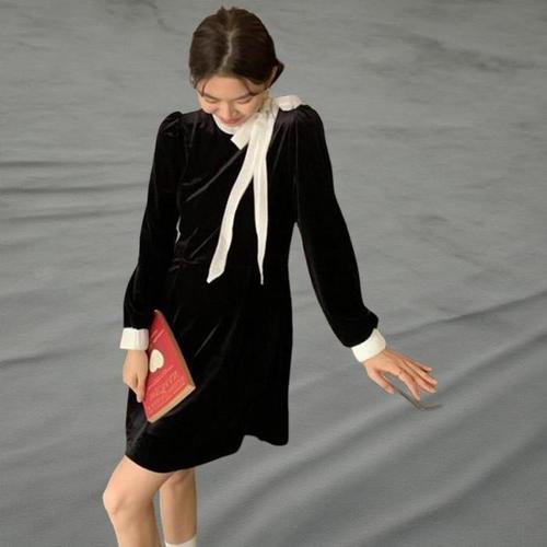 [신상오픈런]여성 클래식 블랙 벨벳 배색 리본 두꺼운 미니 드레스 (41006194)