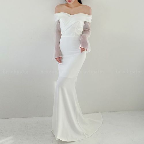 비치팜 / 미엘 오프숄더 머메이드 웨딩 드레스 셀프웨딩 시스루 오간자 쉬폰