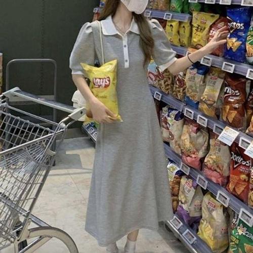 [셀러허브_여성트랜드패션]ONM 여성 롱원피스 카라배색 단아 셔링퍼프소매 여성스