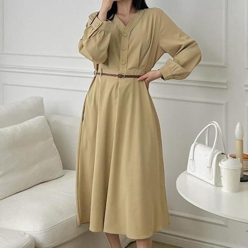 [신상오픈런]여성 퍼프소매 셔링 롱원피스 투버튼 빅사이즈 허리끈 디자인 (40734328)