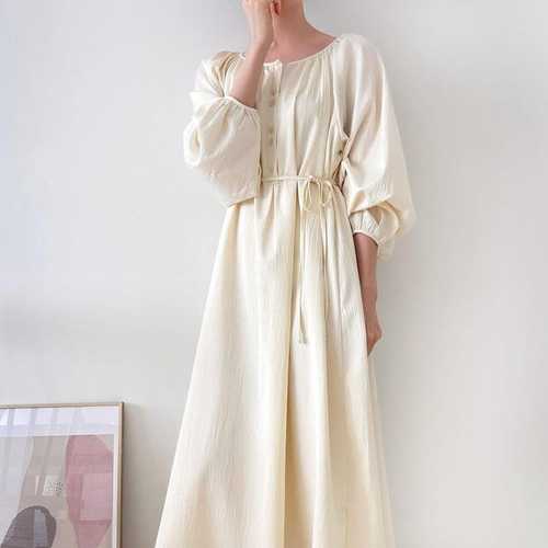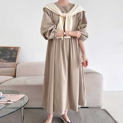 [신상오픈런]리본끈 올셔링 라운드넥 스판 벌룬 봄긴팔 롱원피스 (30953251)