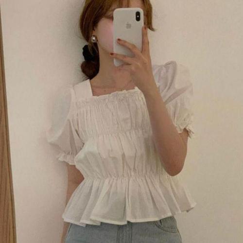 [신상오픈런]여성 여름 휴가 오프숄더 셔링 퍼프 크롭 블라우스
