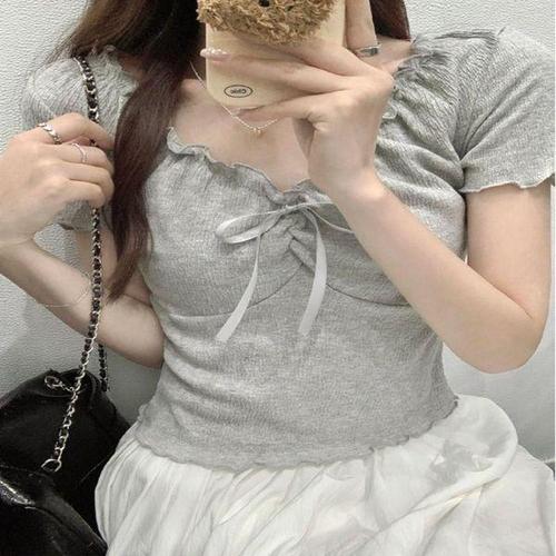 [에이치플러스몰]데일리룩 티셔츠 셔링 반팔 리본 여성 블라우스 여름