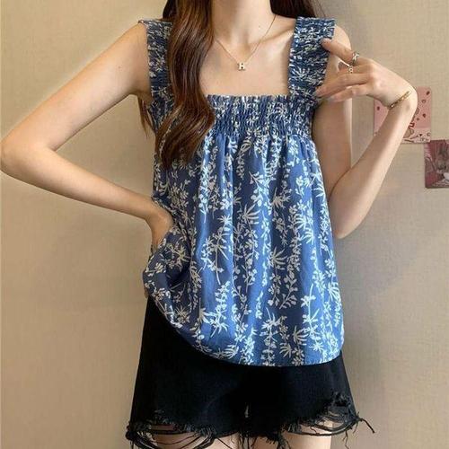 [에이치플러스몰]꽃무늬 가슴셔링 민소매 여름 여행 시원한 블라우스