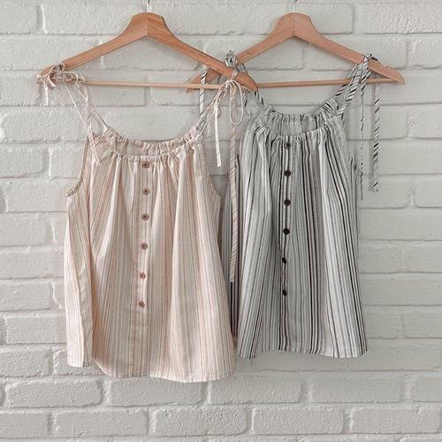 [옷자락]여성 여름 스트라이프 리본 나시 블라우스 셔링 버튼 디자인