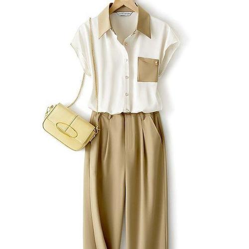 2종세트(1+1) 여성용 심플 루즈핏 롤업 반팔셔츠 순색 투포켓 카라넥 반팔 셔츠 블라우스 세련된 직장인 상의 티 셔츠
