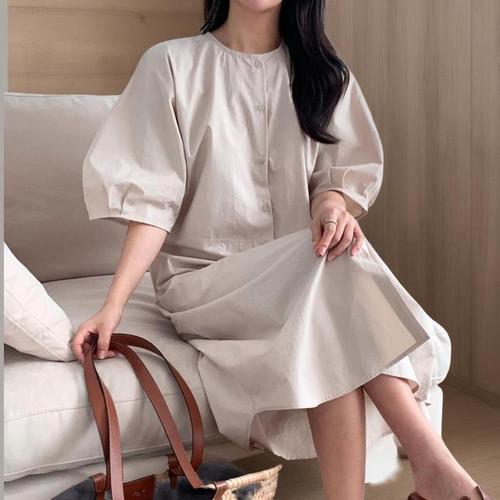 [신상오픈런]여성 피크닉 스타일 벌룬소매 단추 디자인 라운드넥 긴 원피스 (34574837)