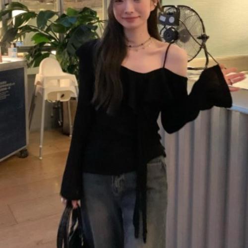 [라일리여성의류] Rly 원오프숄더 프릴 긴팔 티셔츠 나팔소매 앞면 러플