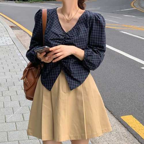 옷자락 / 여성 셔링 브이넥 크롭 블라우스 가을 퍼프소매