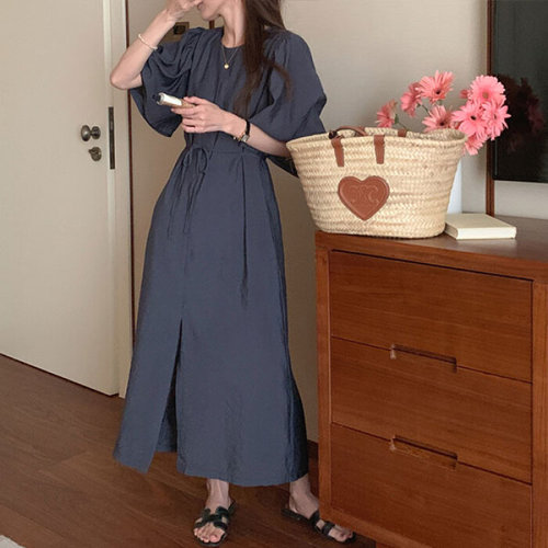 슈팅스타 / 퍼프소매 셔링 허리 스트랩 놈코어 반팔 롱 원피스