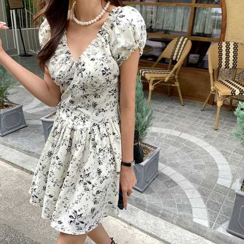 슈팅스타 / 에이라인 양브이넥 셔링 캡소매 플라워 미니원피스