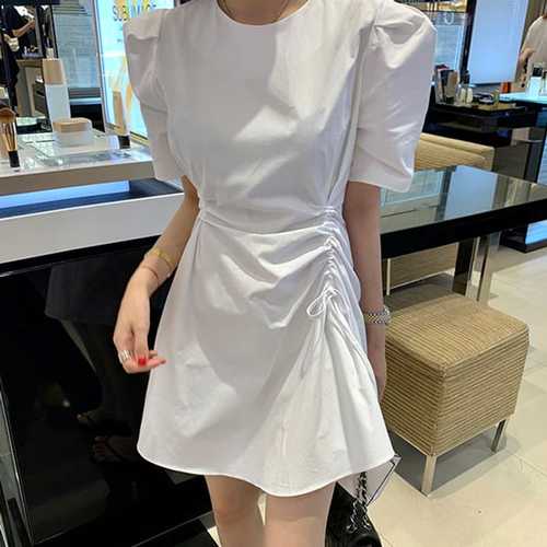 슈팅스타 / 허리 스트랩 퍼프소매 셔링 미니스커트 반팔 원피스