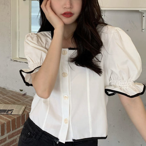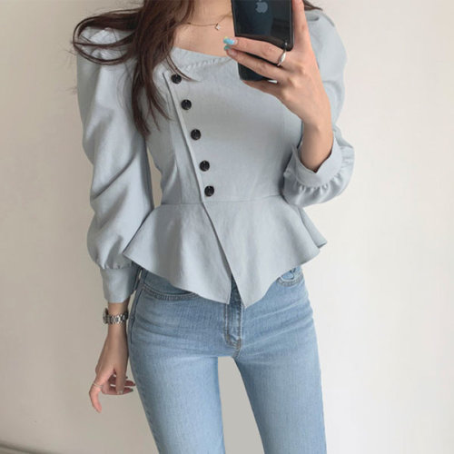 슈팅스타 / 언발란스 단추 퍼프소매 프릴 숏 블라우스