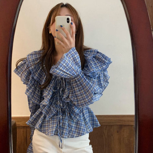 슈팅스타 / 체크 프릴 트럼펫 소매 스트랩 블라우스