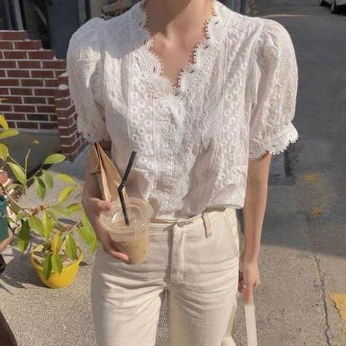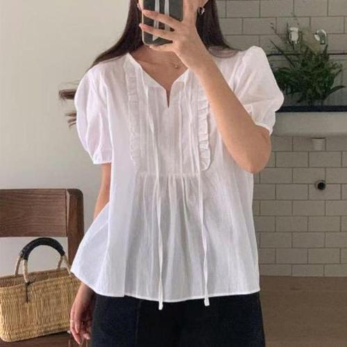 [에이치플러스몰]화이트 프릴 이중소매 여성 반팔 블라우스 여름 코튼