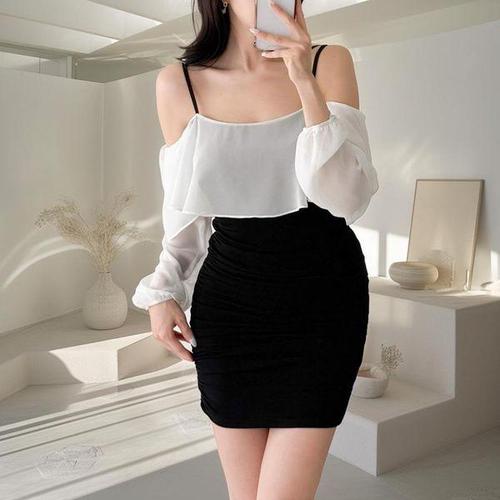 [다잇템]여성 콘트라스트 시크룩 시폰 볼드숄더 원피스