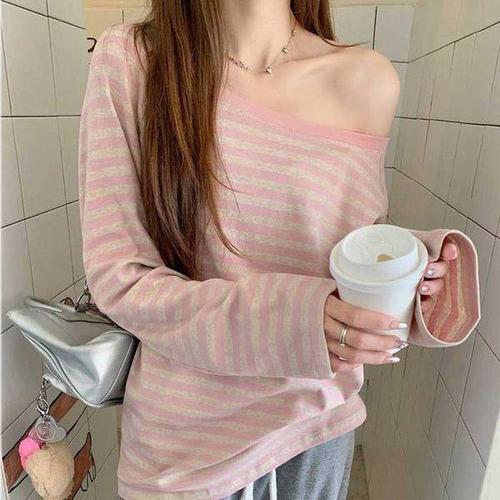 [셀러허브_여성트랜드패션]Rly 스트라이프 오프 숄더 루즈 핏 긴팔 티 날씬해보