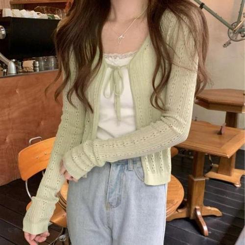 [에이치플러스몰]펀칭 니트 카디건 여름 숏 크롭 가디건 브이넥 여성
