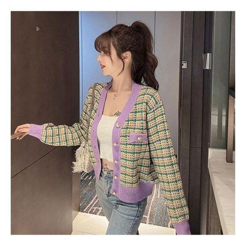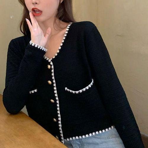 [에이치플러스몰]금장 단추 배색 니트 가디건 브이넥 숏 스티치 간절기