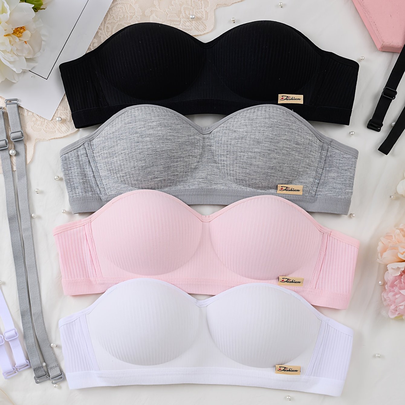 TEMU 4피스 십대 여학생 속옷, 노 와이어 브라, 발육기 브라, 처짐 방지 편안한 브라, 조절 가능한 어깨 스트랩, 탈착 불가능한 가슴 패드 속옷, 13-16세 여학생에게 적합