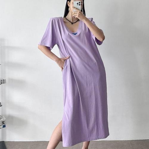 해피유통 여성 순면 루즈핏 빅사이즈 솔리드 원피스 펀칭 트임 롱티 원피스 jhljq