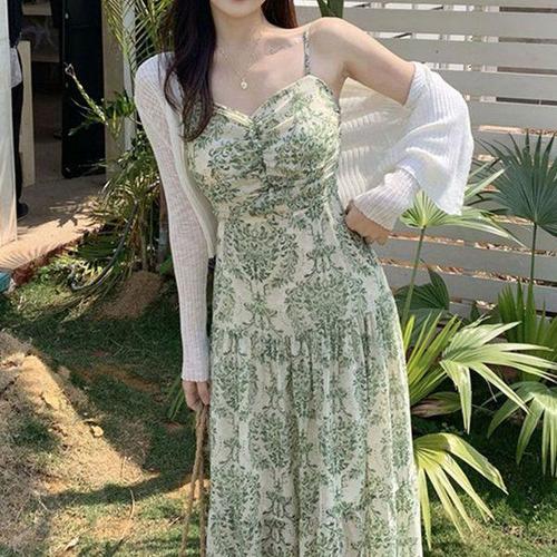 [에이치플러스몰]쉬폰 나염 여성 끈 나시 캉캉 원피스 여름 휴양지룩