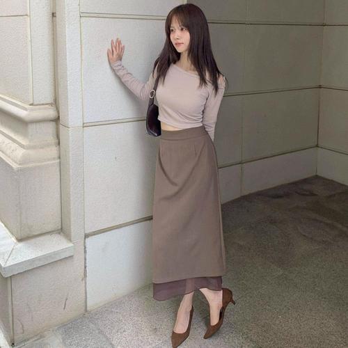 [옷자락] 여성 사랑스러운 쉬폰 배색 뒷밴딩 셔링 롱 스커트