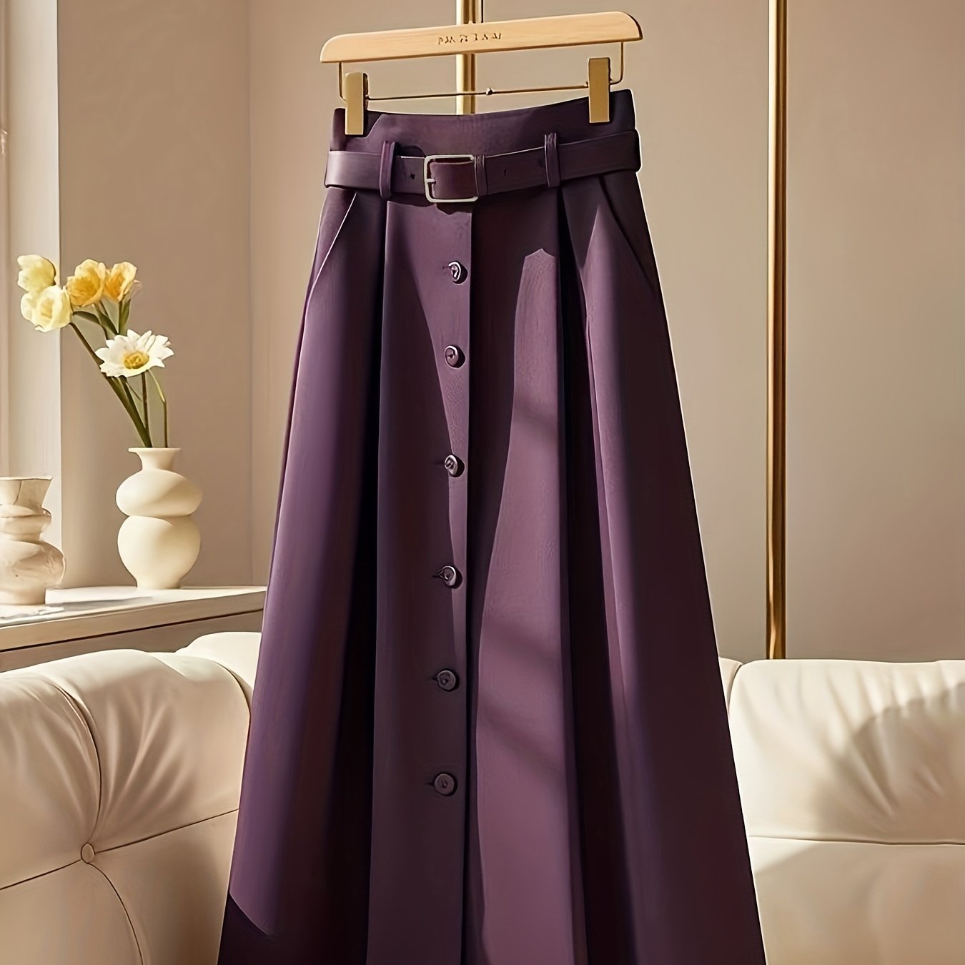 TEMU 보라색 하이웨이스트 A라인 스커트, 플레어 우산 스커트, 미디 기장 스커트, 벨트 장식 버튼 스커트