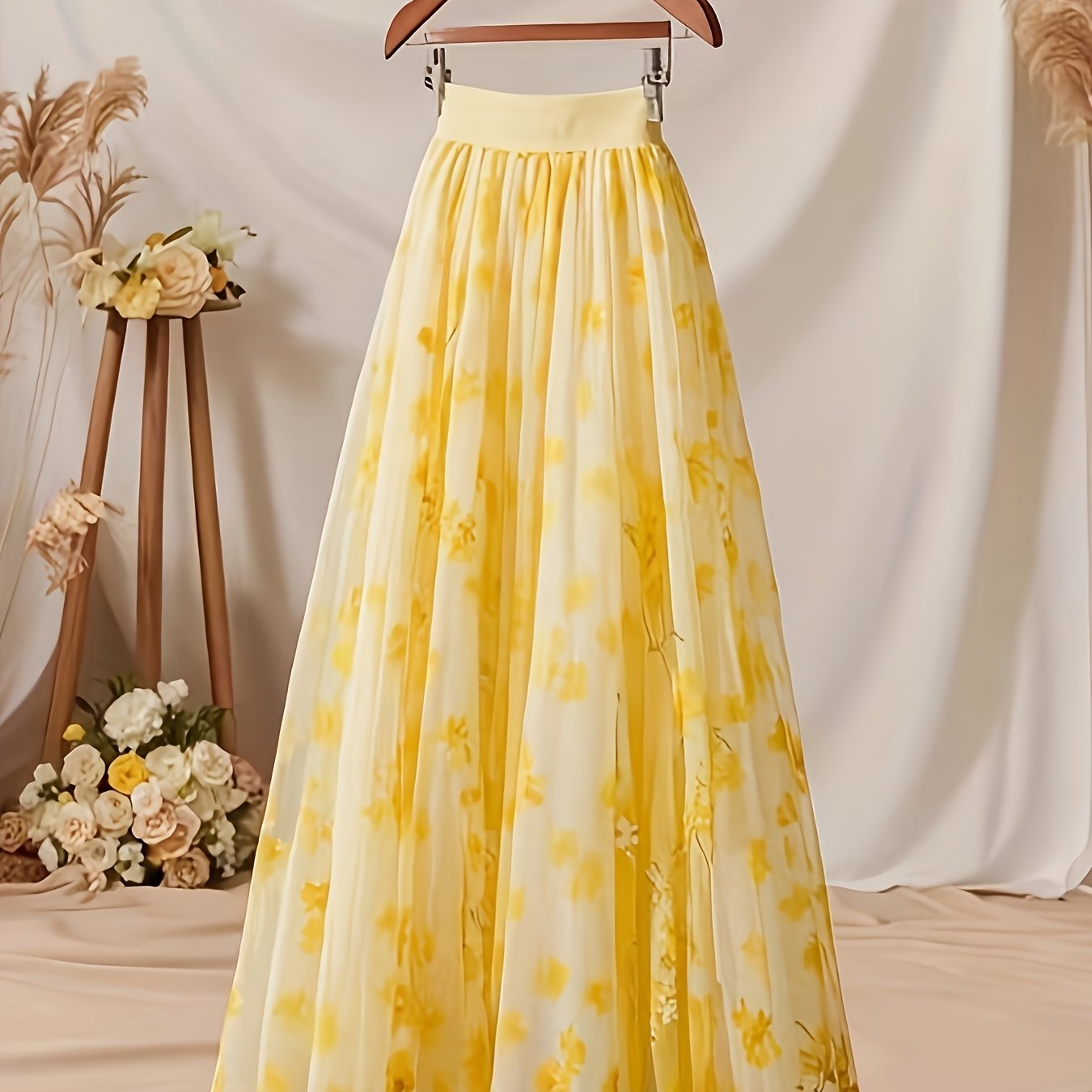 TEMU 우아한 여성용 하이웨이스트 플레어 스커트, 가볍고 프린트된 탄성 허리 스커트 (봄, 여름, 가을용), 휴가 캐주얼 패션에 적합, 귀여운 미디 스커트