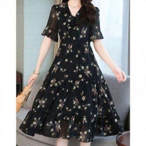 프롬코 여성 예쁜 플라워 반팔 롱 쉬폰 원피스 FRC182