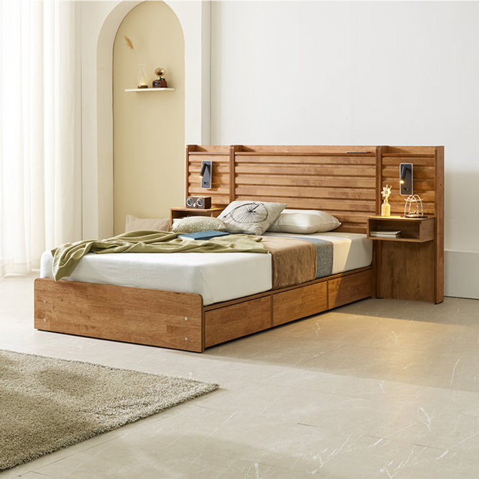 올레타 호텔식 고무나무원목 수납형 슈퍼싱글침대SS+조명협탁+독립매트리스포함